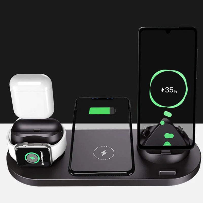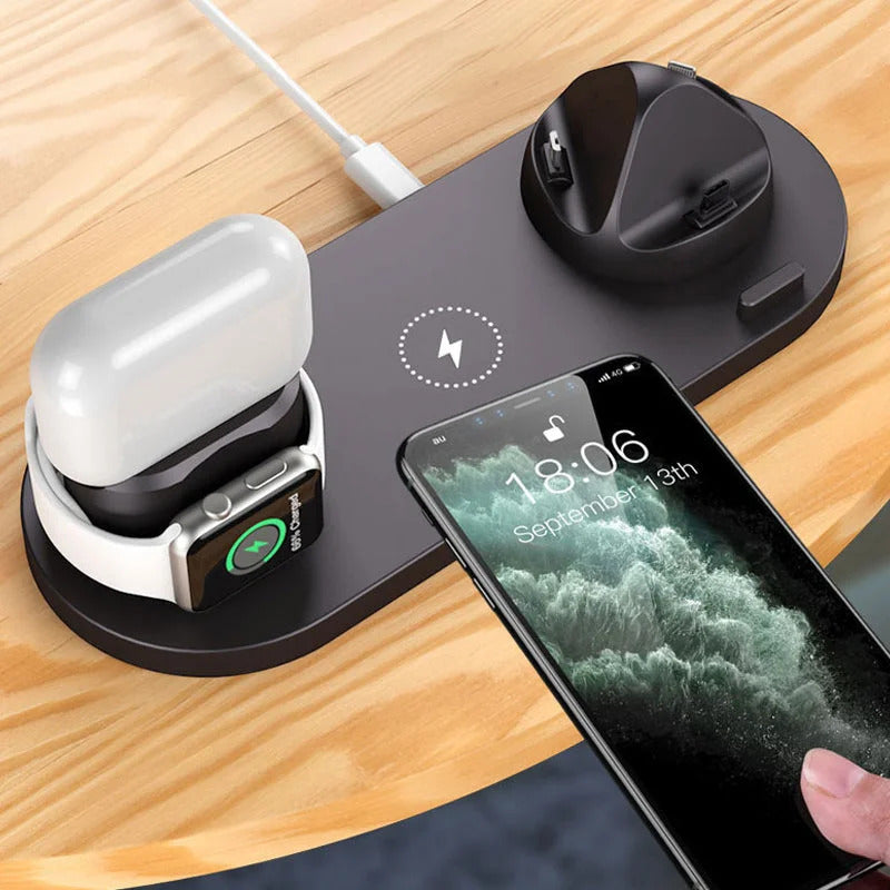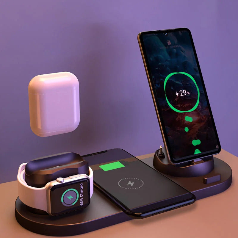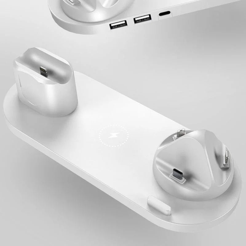 Optimieren sie den ladevorgang mit der neuen und verbesserten 6-in-1-smart-ladestation. Mit diesem ladegerät aus hochwertigem material mit matter oberfläche können sie ihre apple watch, airpods und ihr smartphone schnell aufladen. Verwandeln sie ihren schreibtisch in den ordentlichen arbeitsbereich, den sie sich immer gewünscht haben.